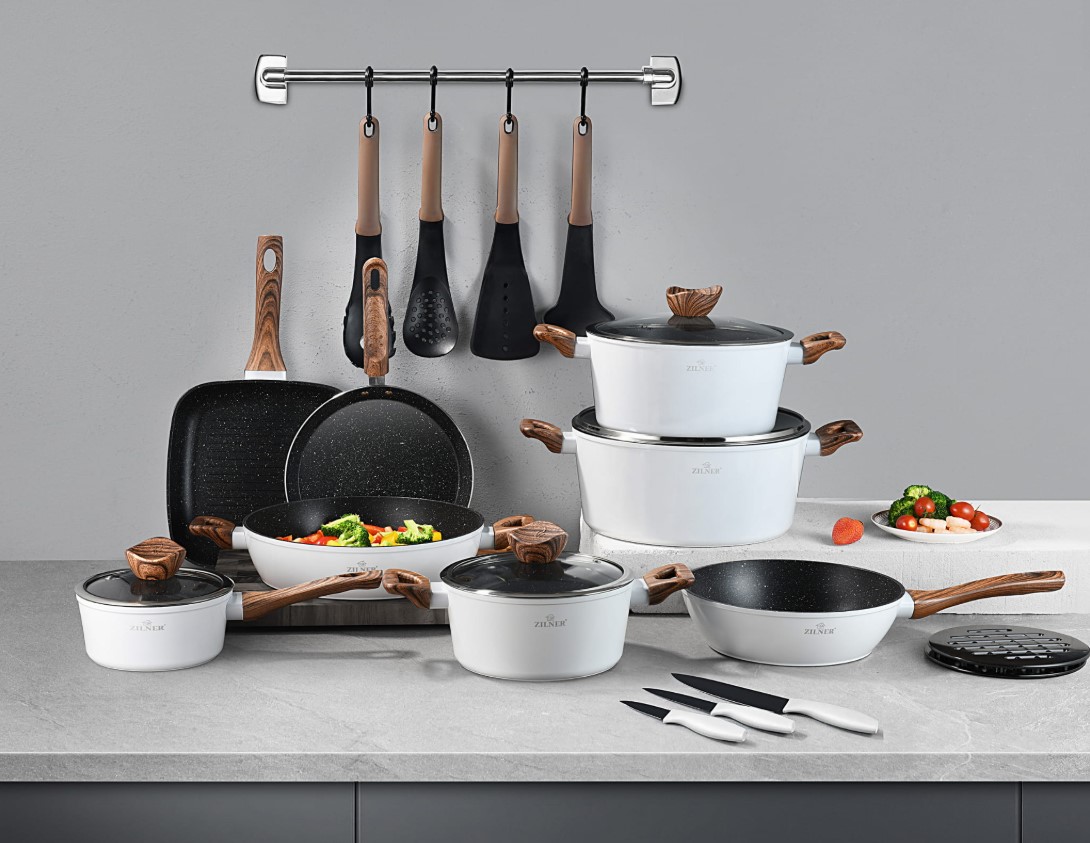 21 daļu virtuves trauku komplekts “Zilner ZL-8543” ir lieliska izvēle tiem, kas novērtē augstas kvalitātes virtuves piederumus. Šis komplekts ir ne tikai funkcionāls, bet arī stilīgs, tāpēc lieliski papildinās jebkuru virtuvi neatkarīgi no tā, vai gatavojat katru dienu vai gatavojaties svētkiem. Visiem traukiem ir marmora pārklājums, kas nodrošina ilgmūžību un izturību pret skrāpējumiem.