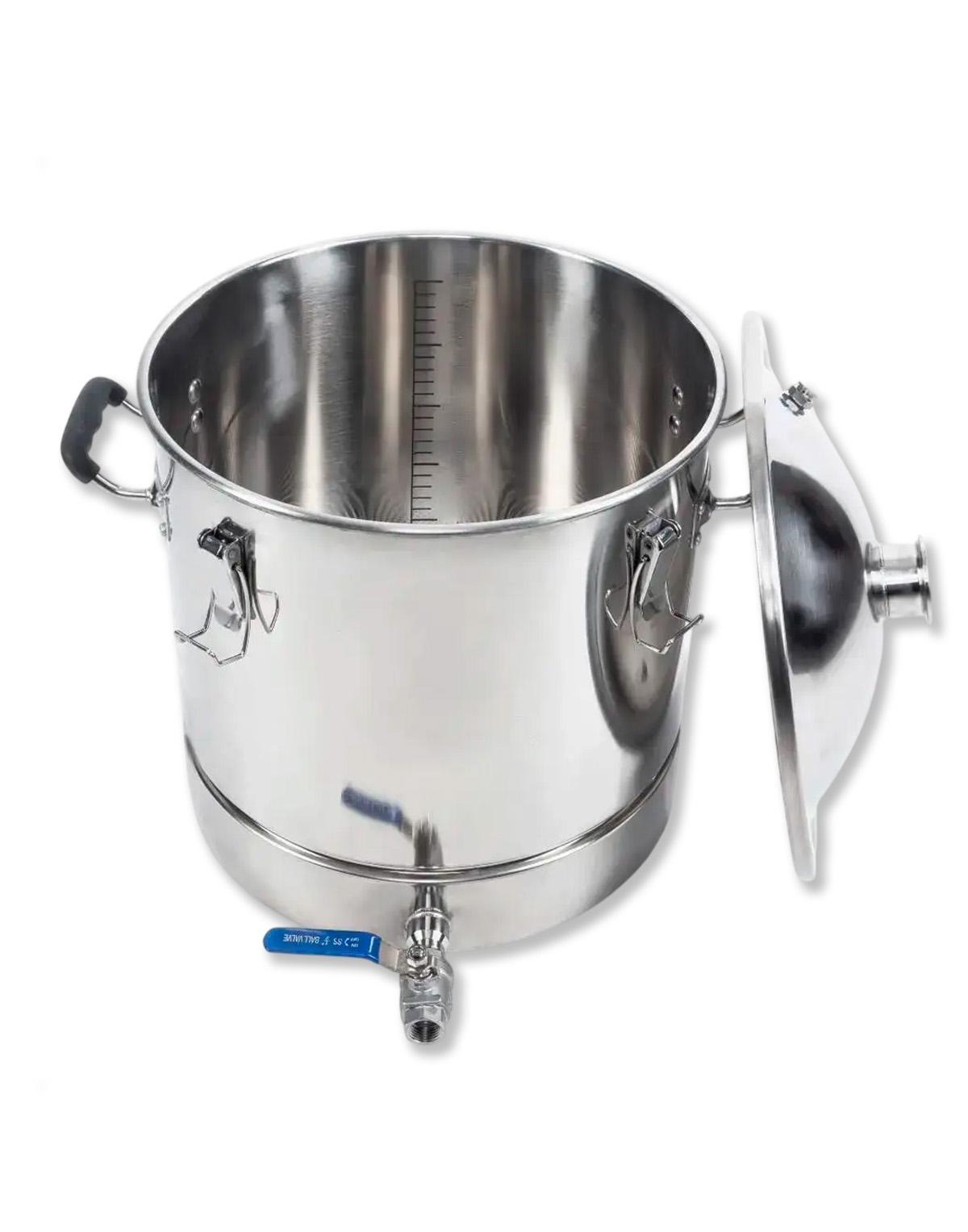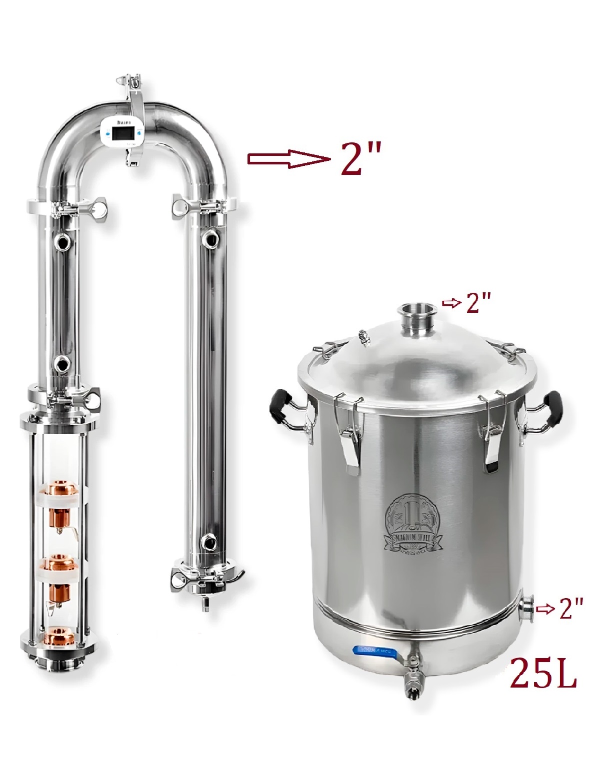 1) 25 litru destilācijas tvertne ar kupola vāku 2″ clamp-savienojumam, pārtikai paredzēts nerūsējošais tērauds AISI304;