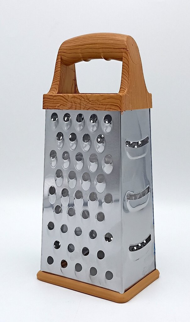 - Universālums: Katrai pusei ir dažāda izmēra un formas asmeņi (zobi). Tas ļauj izvēlēties piemērotu smalcināšanas pakāpi – no rupjas rīvēšanas kartupeļu pankūkām vai sieram līdz smalkai rīvēšanai burkāniem, citrona miziņai vai šokolādei.