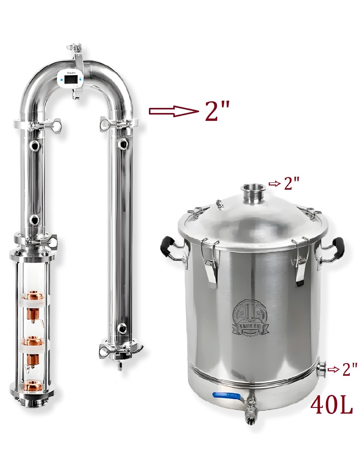 1) 40 litru destilācijas tvertne ar kupola vāku 2″ clamp-savienojumam, pārtikai paredzēts nerūsējošais tērauds AISI304;