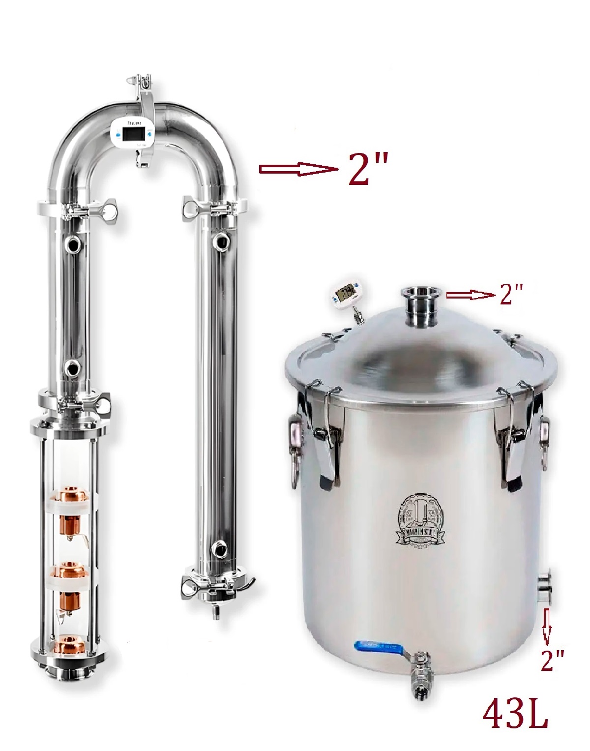1) 43 litru destilācijas tvertne ar kupola vāku 2″ clamp-savienojumam, pārtikai paredzēts nerūsējošais tērauds AISI304;