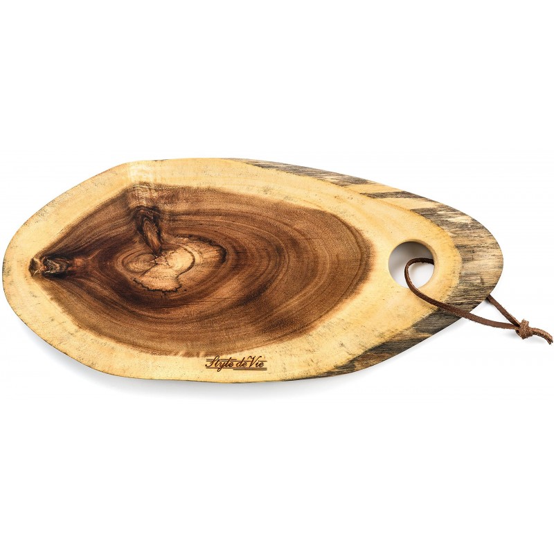 Šis augstas kvalitātes akācijas koka servēšanas dēlis ir ar cilpu ar ādas auklu – pateicoties tam, servēšana kļūst daudz patīkamāka. Katrs dēlis ir unikāls savā formā un izmēros, un tam ir raksturīgs koka raksts.