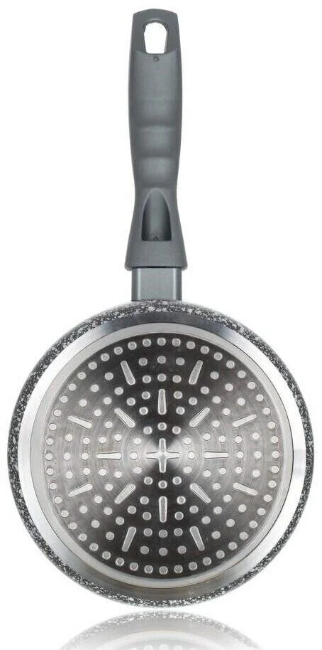 - Vieglums: Alumīnija korpuss ir ievērojami vieglāks par tēraudu vai čugunu, tāpēc trauku ērti cilāt pat ar vienu roku, kad tas ir pilns.