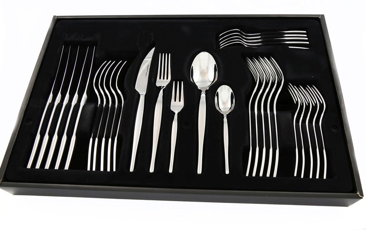 Komplektā atradīsiet visu nepieciešamo 6 personu galda klāšanai: galda nažus, dakšiņas, karotes, tējas karotītes un desertdakšiņas. Smalki zobaini nažu asmeņi ir lieliski piemēroti arī gaļas ēdienu griešanai.