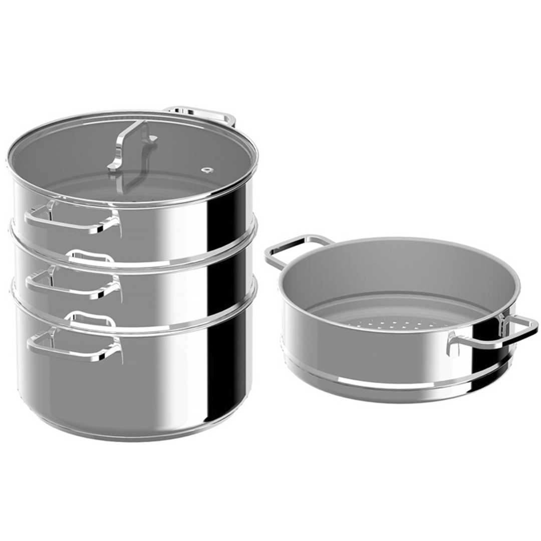 Šis universālais komplekts sastāv no liela apakšējā katla un trim uz tā liekamiem tvaicēšanas ieliktņiem. Tas ļauj izveidot pat 4 līmeņu sistēmu: apakšējā katlā varat vārīt kartupeļus vai rīsus, bet augšējos stāvos vienlaikus tvaicēt dārzeņus, zivis vai vistu. Produkti nezaudē savu garšu un aromātu, jo tvaiks cirkulē starp stāviem.