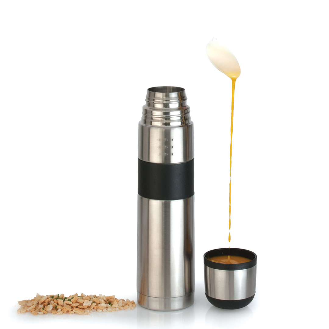 - Ērts un funkcionāls dizains: Elegantajam un praktiskajam termosam ir ērts rokturis. Izliešanas sistēma ar pogas nospiešanu ļauj ieliet dzērienu, neatgriežot visu korķi, tādējādi izvairoties no siltuma zudumiem. Turklāt vāciņš kalpo kā ērta krūze.