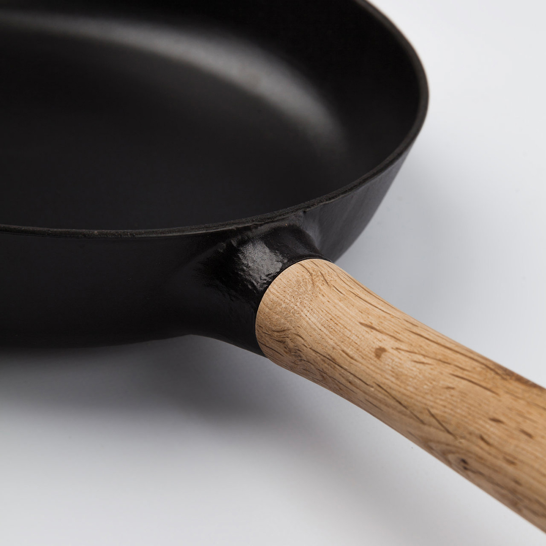 - Izturīgs emaljas pārklājums: Pannas iekšpuse un ārpuse ir pārklāta ar izturīgu melnu emalju. Šis pārklājums aizsargā čugunu no rūsas, atvieglo tīrīšanu un, atšķirībā no tradicionālajām čuguna pannām, neprasa īpašu apkopi vai sagatavošanu (sezonēšanu).