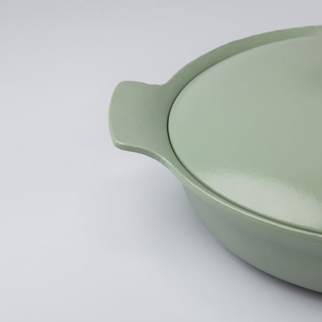 Panna izgatavota no augstas kvalitātes čuguna, kas nodrošina ideāli vienmērīgu karstuma sadali un ilgstoši uztur siltumu. Tas ļauj sasniegt izcilus apcepšanas rezultātus un lēnām sautēt ēdienus. Iekšējais, gaišā krēmkrāsas emaljas pārklājums ir nepiedegošs, izturīgs pret skrāpējumiem, viegli tīrāms un izgatavots, neizmantojot kaitīgas PFOA vielas.