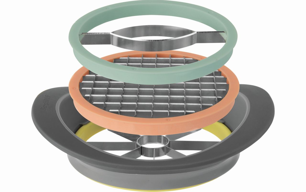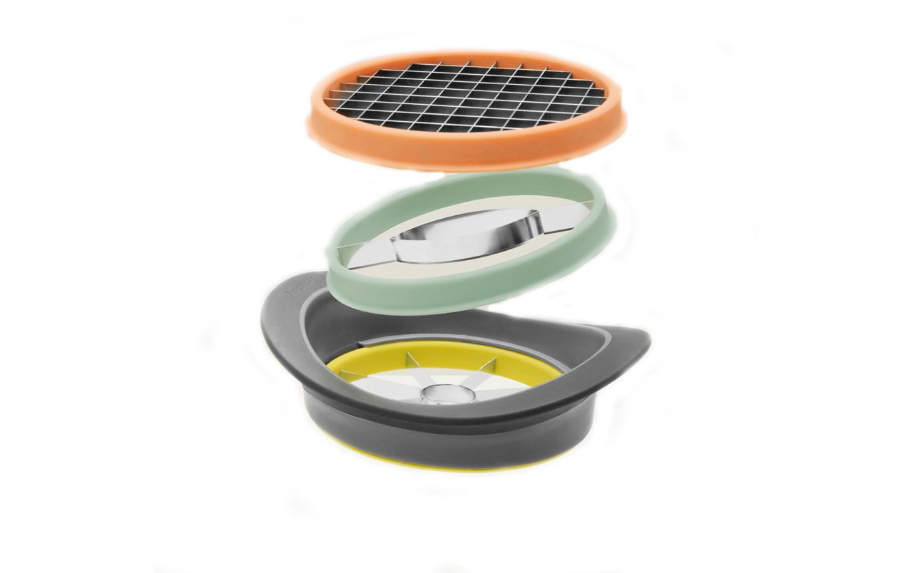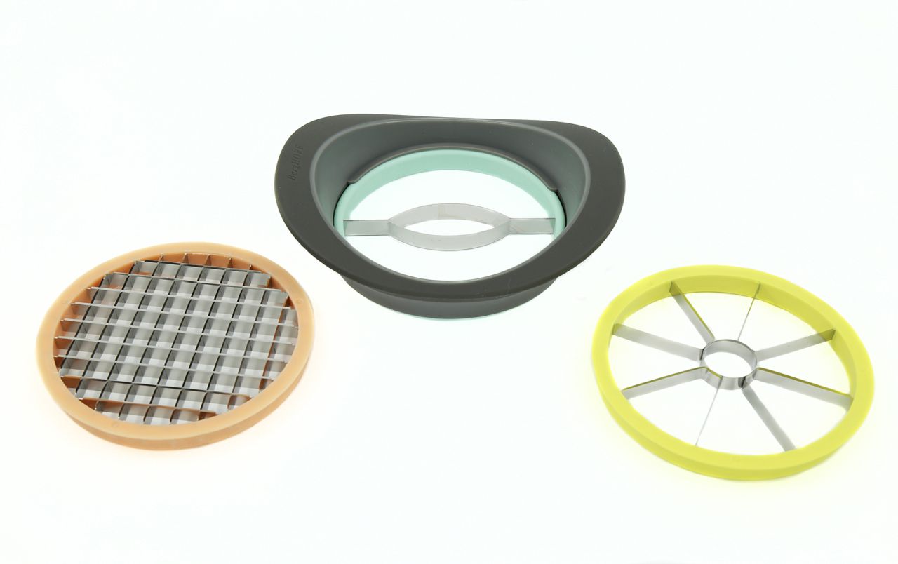 Kompakts, daudzfunkcionāls 3-in-1 griezēju komplekts ar maināmiem asmeņu piederumiem. Paredzēts ātrai un drošai augļu un dārzeņu sagatavošanai dažādās formās (šķēlēs, pusītēs, stienīšos).