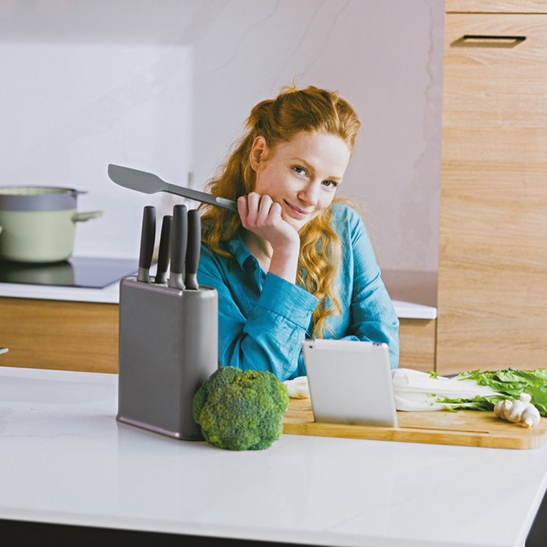 Mentele ir droša ne tikai nelipīgiem traukiem, bet arī nerūsējošā tērauda traukiem. To var mazgāt trauku mazgājamajā mašīnā, tāpēc ceptu pīrāgu varat ļaut tīrīt trauku mazgājamajā mašīnā. Vai jūsu virtuves plaukts ir pārpildīts? Vienkārši izmantojiet rokturī esošo caurumu, lai ērti pakārtu menti uz atveseļa.