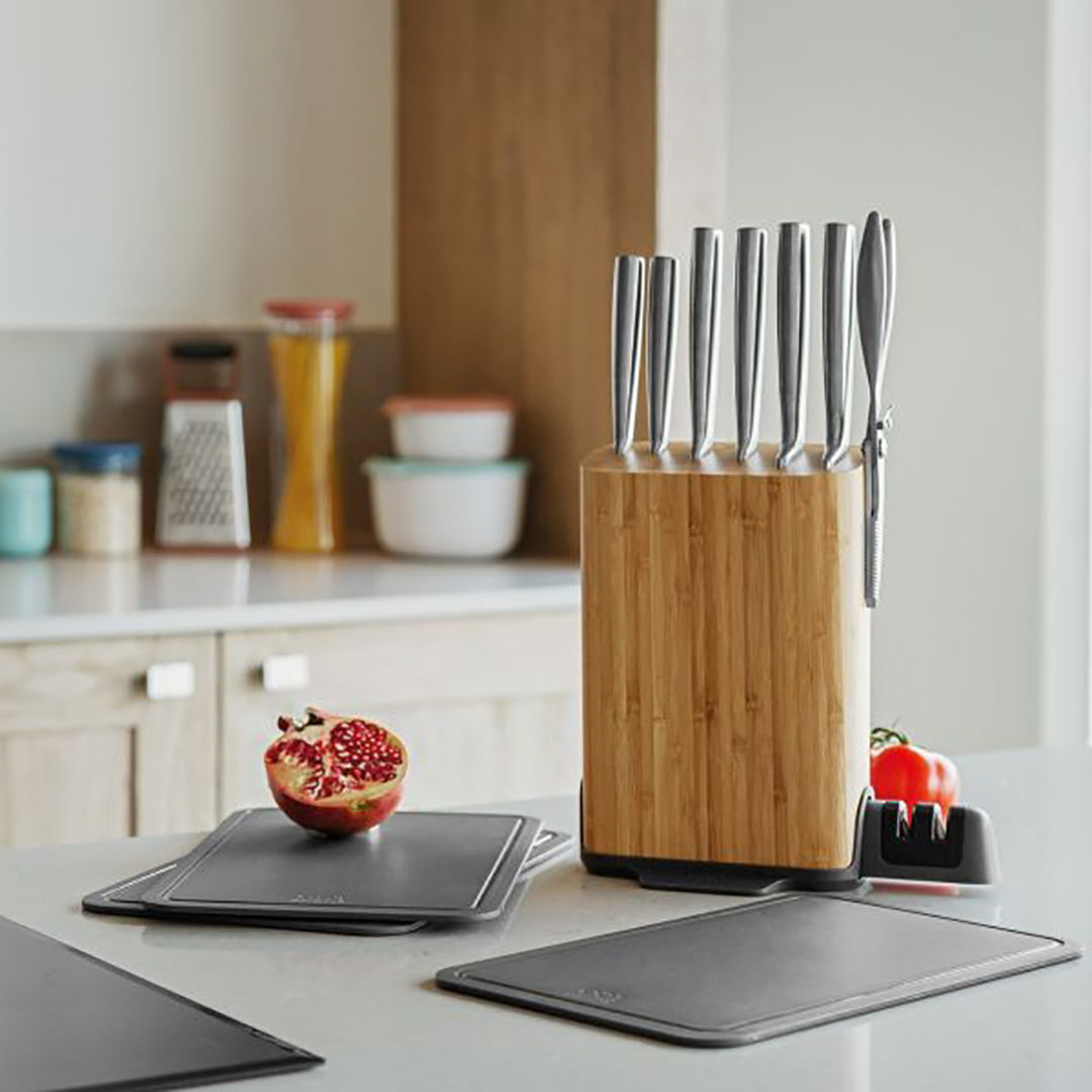 Šī komplekta sirds ir koka statīvs, kas pilda vairākas funkcijas. Tajā ne tikai droši un kārtīgi tiek glabāti naži, bet ir arī īpašas vietas trim griešanas dēlīšiem un komplektā iekļautajam asinātājam. Turklāt statīva sānos ir iebūvēts spēcīgs magnēts, uz kura ir ērti turēt virtuves šķēres vai citus metāla instrumentus.