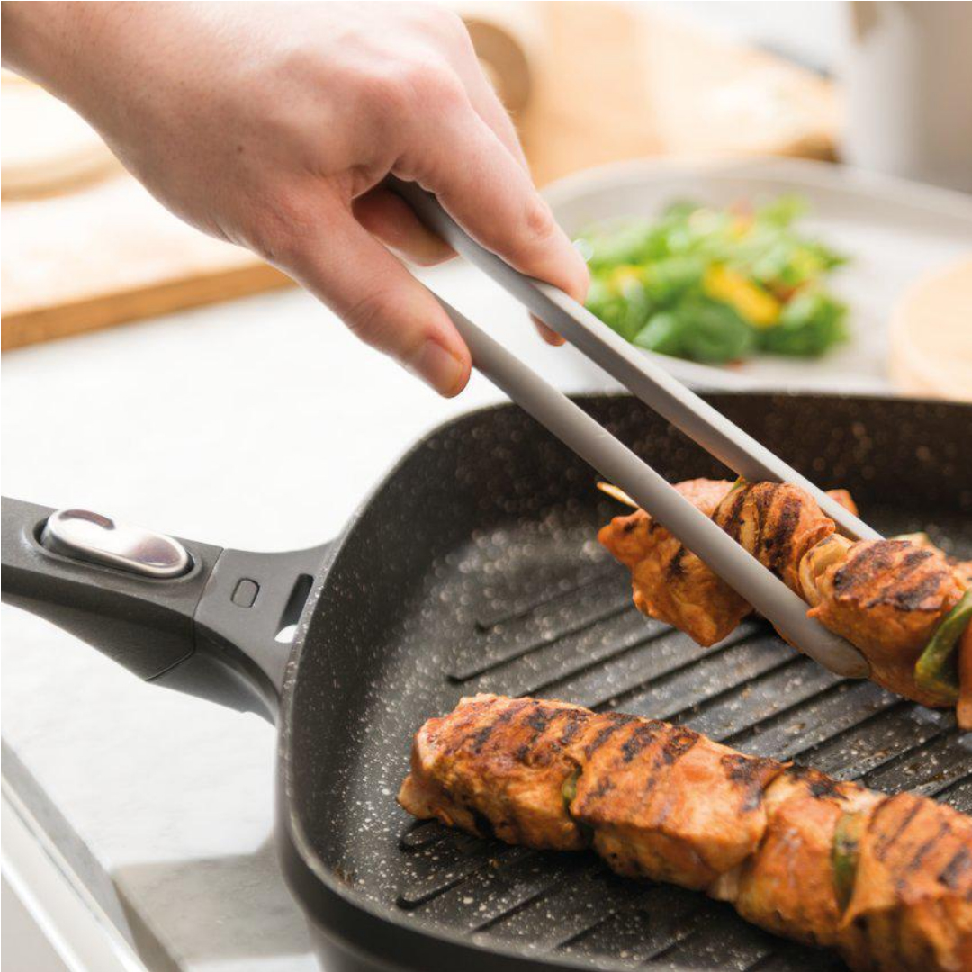 Universālas, karstumizturīgas neilona knaibles ar fiksācijas mehānismu, kas paredzētas drošai ēdiena apgriešanai, paņemšanai un pasniegšanai, īpaši lietojot traukos ar nelipīgu pārklājumu.
