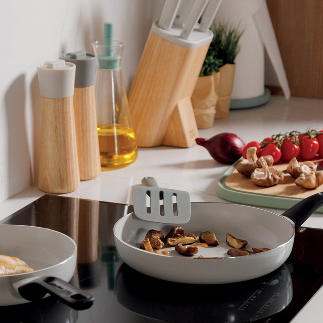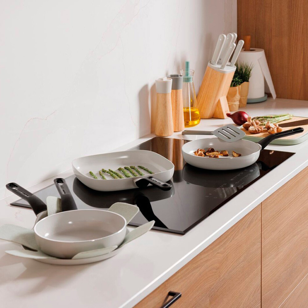 BergHOFF Glints Spirit kolekcija no Belgijas ražotāja BergHOFF ir lieliska videi draudzīgas, funkcionālas un minimalistiskas dizaina apvienojums. Ielietots alumīnija korpusa nodrošina ātru uzsildīšanos un vienmērīgu siltuma sadali, tādējādi gatavošana un tīrīšana kļūst vieglāka. Iesakām mazgāt ar roku un izmantot virtuves rīkus, kas nav no metāla (plastmasas, silikona, koka), lai nepašķīdinātu nepielipīgo pārklājumu.