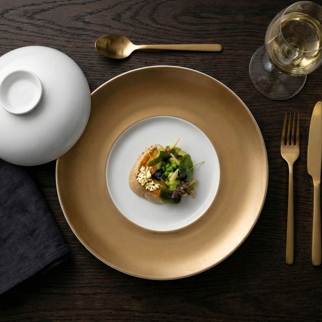 - ✅ Galda rotājums: Grezna balta porcelāna un zelta joslas kombinācija.