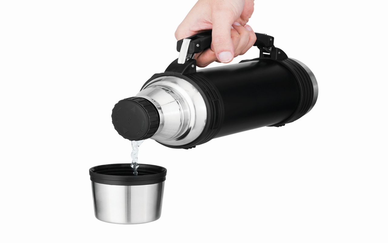 - Maksimāls komforts: Platais, ērtais rokturis nodrošina stingru satvērienu, bet izliešanas sistēma ļauj ieliet dzērienu, tikai nedaudz atskrūvējot korķi – tādējādi tiek zaudēts mazāk siltuma. Vāciņš kalpo kā ērta un stabila krūze.