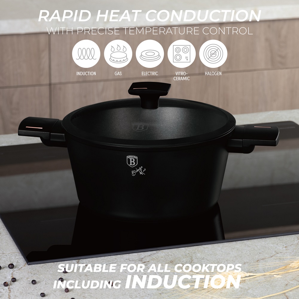 - Universalitāte: Komplekts ir saderīgs ar visiem virdžīna tipiem – indukcijas, gāzes, elektriskiem un keramiskiem.