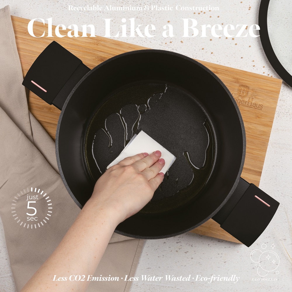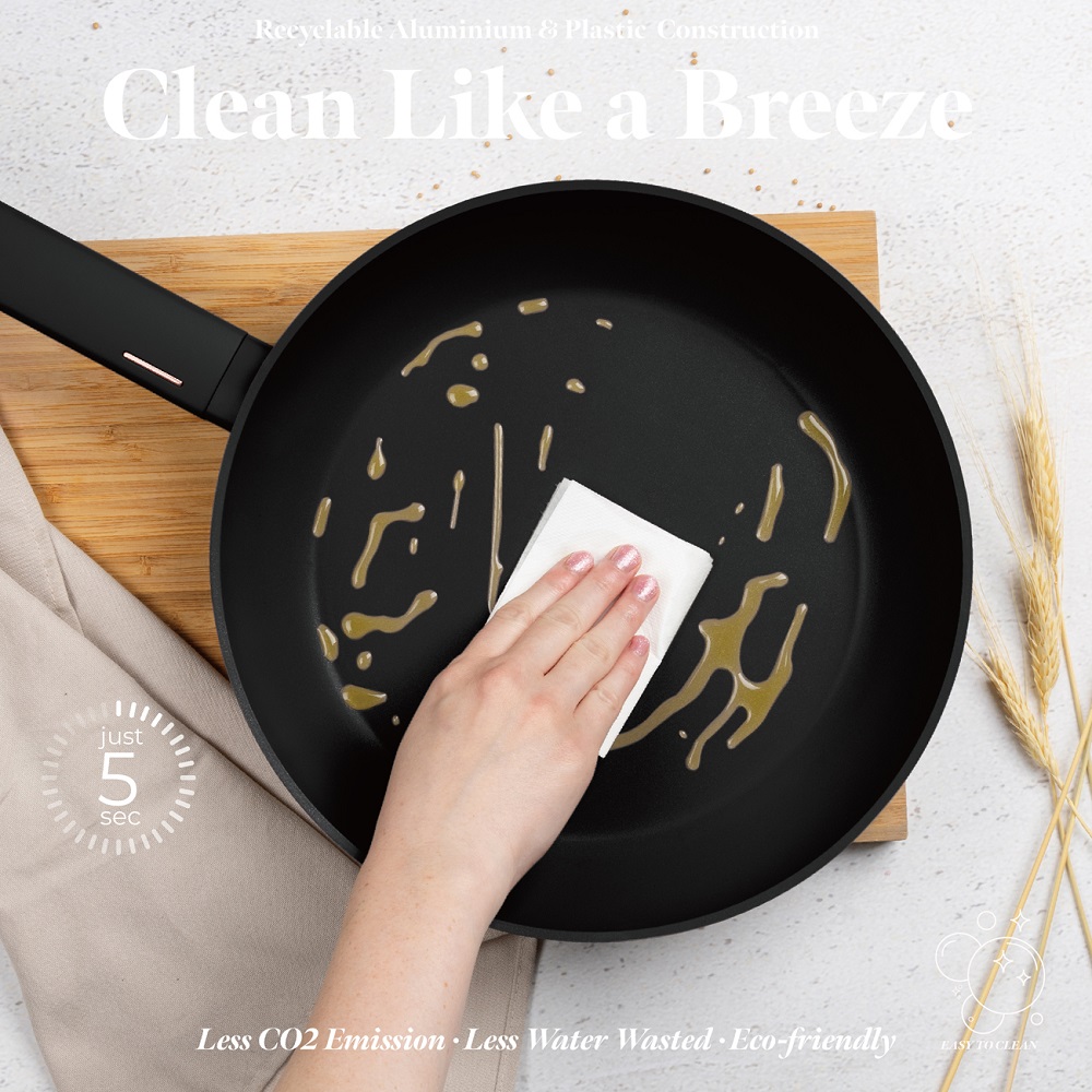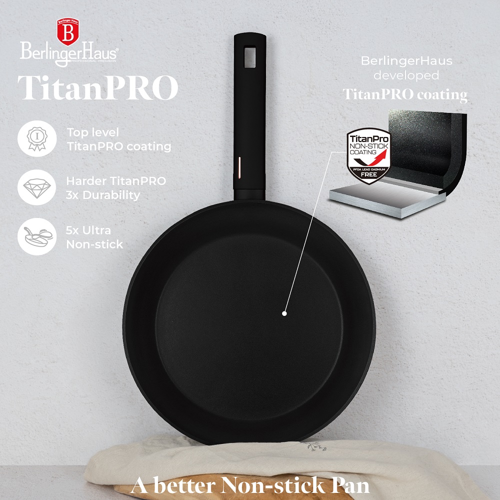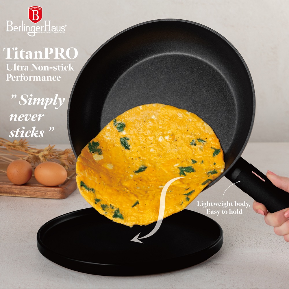 - Paaugstināts neklibošs pārklājums: TitanPro tehnoloģija neļauj ēdienam pielipt, aizsargā no skrāpējumiem un ļauj gatavot bez liekā eļļas.
