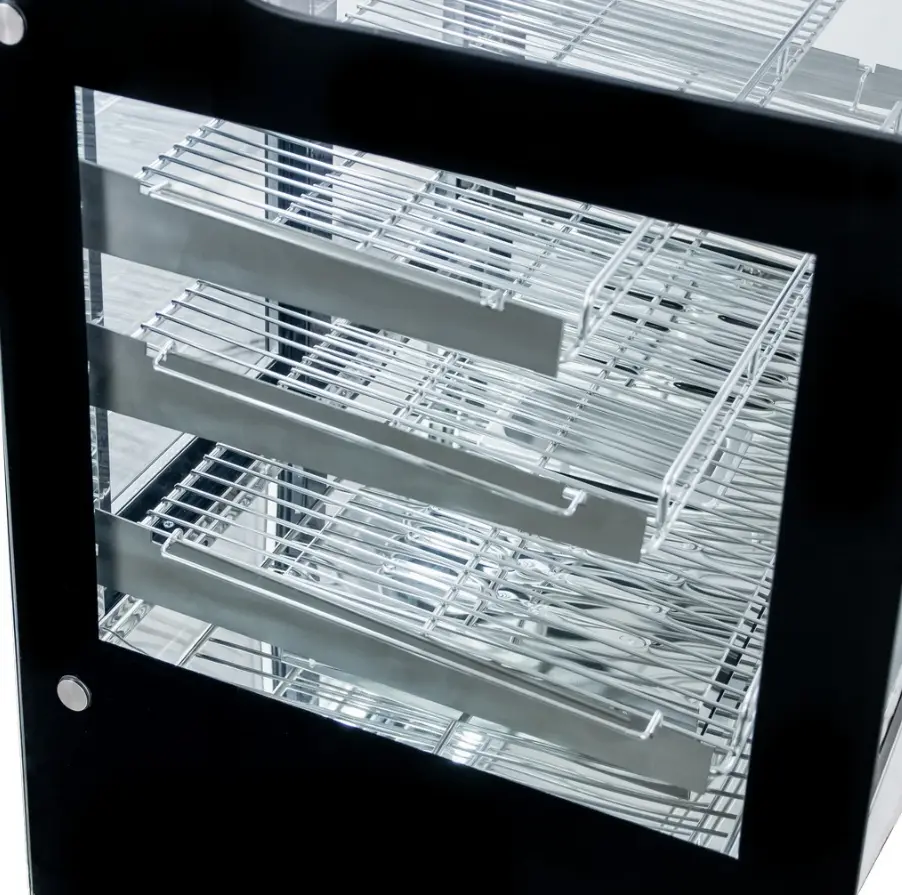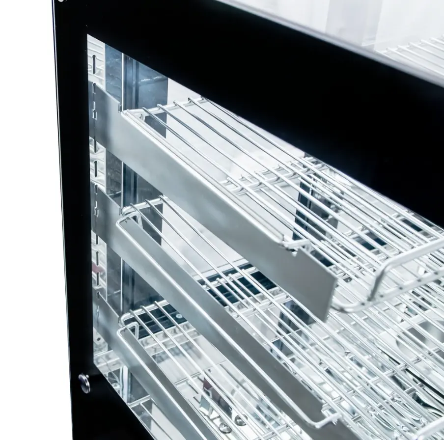 Nē, šis modelis ir paredzēts siltuma uzturēšanai bez papildu mitrināšanas, tādēļ tas ir vispiemērotākais konditorejas izstrādājumiem, picām un uzkodām, kam nav nepieciešams augsts mitruma līmenis.