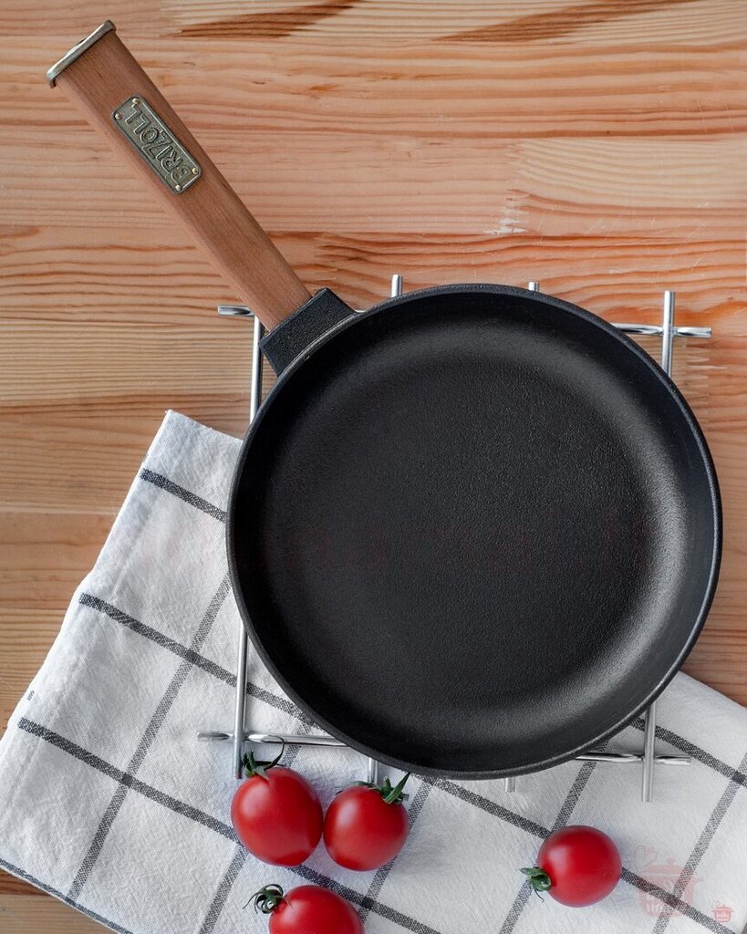 - Noņemams rokturis: Koka rokturis ir ne tikai ērts turēšanai, bet arī noņemams, kas atvieglo pannas uzglabāšanu vai lietošanu cepeškrāsnī (bez roktura).
