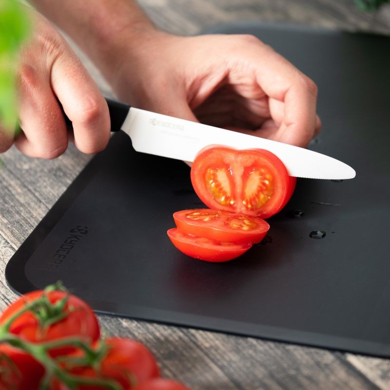 Dantytas keraminis peilis Kyocera specializēts pomidoru un citu produktu griešanai, kurius parastais nazos var sasmelt vai no tiem noripo. Vai jūs mēģinājāt šķērdēt “Napoleona” torti? Tieši tas! Šis asmenaisd galss keraminis peilis risinās daudzas jūsu virtuves problēmas, griežot delikates produktus.