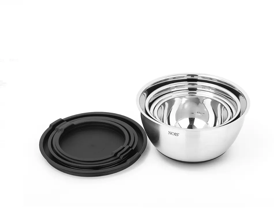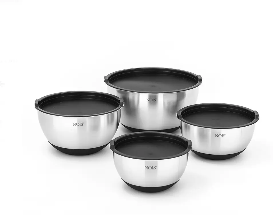 - Vietas taupīšana: visas četras bļodas ieliekas viena otrā, tādēļ atvilktnē aizņem tikai lielākās bļodas vietu.