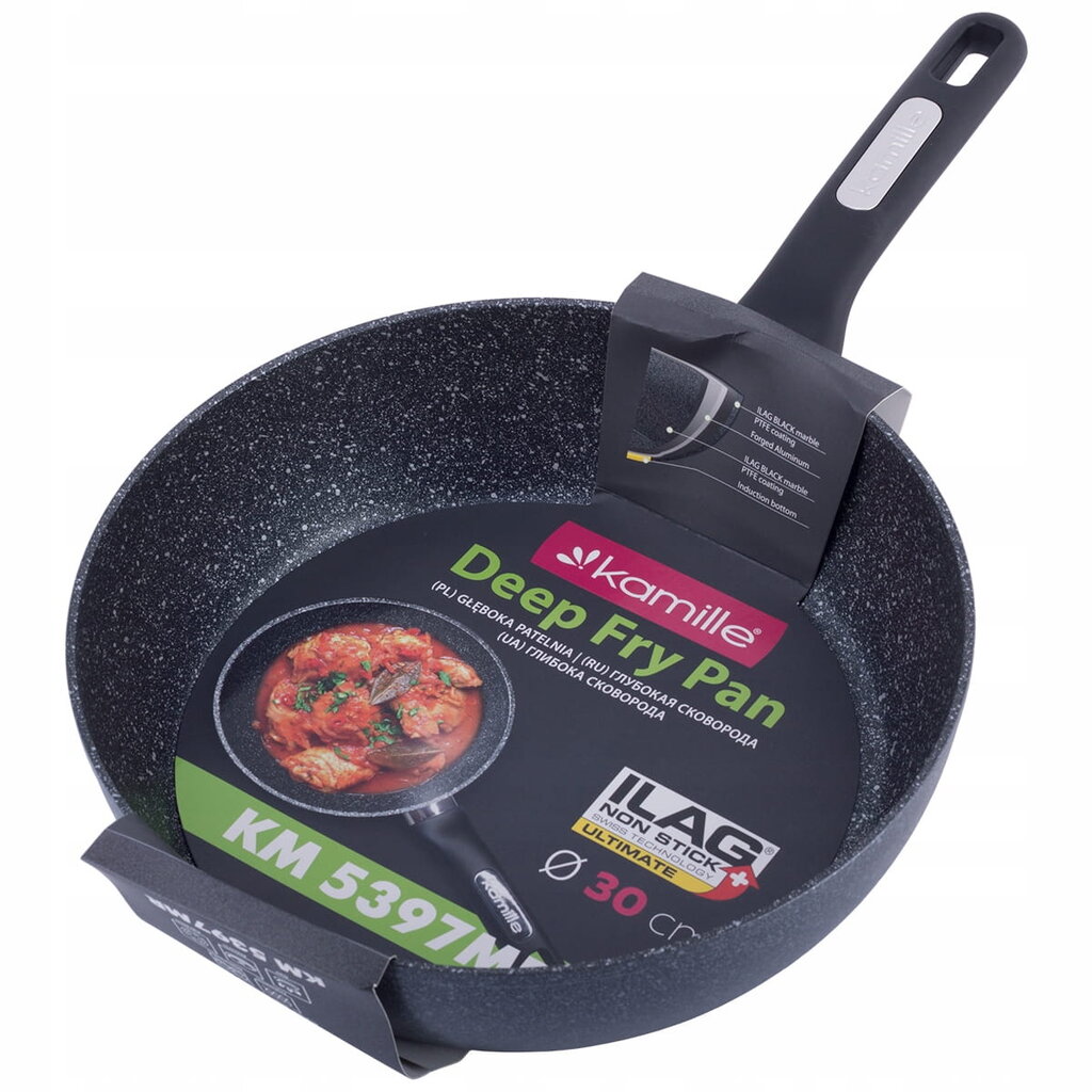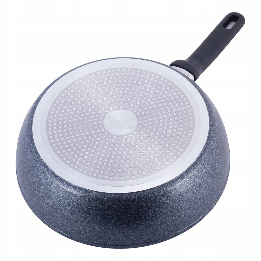„Kamille Marble“ sērijas panna (Ø 26 cm) apvieno modernu dizainu un funkcionalitāti. Izgatavota no izturīga lieta alumīnija, šī panna izceļas ar dziļu korpusu (7,5 cm), tāpēc tā ir ideāli piemērota ne tikai cepšanai, bet arī sautēšanai, mērču gatavošanai vai dažādu ēdienu pagatavošanai.