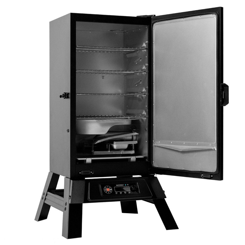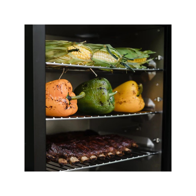 Masterbuilt 710 WiFi – ērti vadāma elektriskā kūpinātava ar Wi-Fi: temperatūru un laiku iestatāt uz korpusa vai Masterbuilt lietotnē tālrunī. Patentētais sānu koka skaidu padeves kanāls ļauj piepildīt skaidas, neatverot durvis, savukārt ūdens trauks, gaisa vārsts un gaļas zondes palīdz precīzi kontrolēt dūmus, mitrumu un rezultātu. Iekšpusē – 4 hromētas plaukti un pilnībā izolēts korpuss ar aizslēdzamu slēdzeni.
