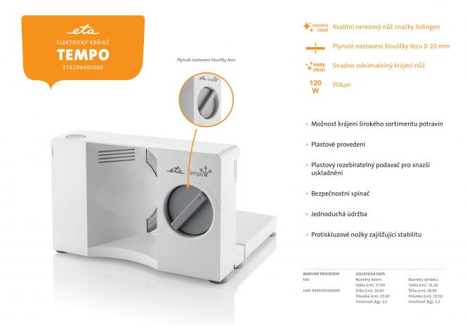 ETA TEMPO ir ārkārtīgi universāls. Tas lieliski tiek galā ar visdažādākajiem uzdevumiem: no svaigas, kraukšķīgas maizes līdz cietam sieram, no žāvēta šķiņķa un desas līdz augļiem un dārzeņiem. Ar pagriežamu rokturi viegli regulējiet griešanas biezumu līdz 20 mm un pielāgojiet to atbilstoši savām vajadzībām.