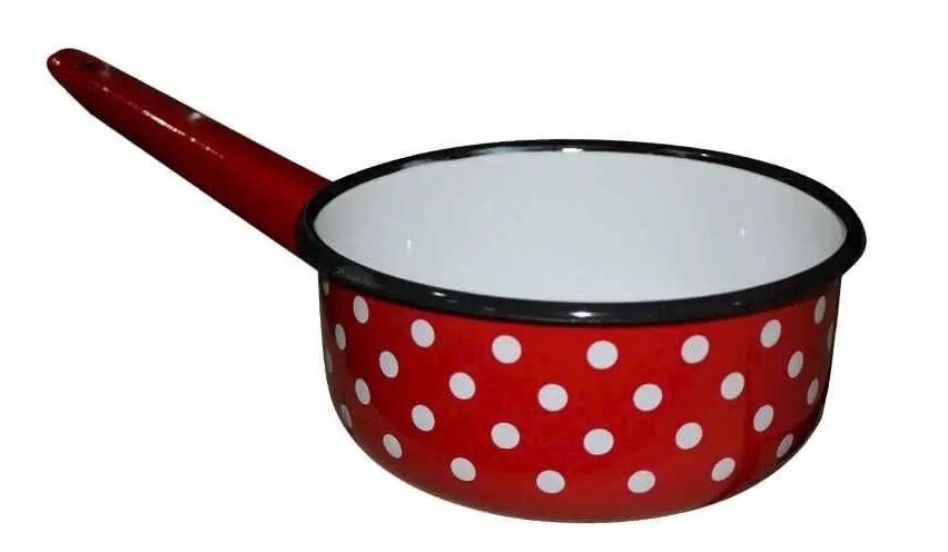 Šis emaljētais ķipītis (kauss) ir neaizstājams palīgs ikdienas ēdiena gatavošanā. Spilgti sarkanā krāsa ar rotaļīgiem baltiem punktiņiem piešķir virtuvei mājīgumu un retro stilu. Pateicoties garajam rokturim, trauku ir ērti izmantot mērču gatavošanai, olu, piena vai neliela daudzuma zupas vārīšanai.