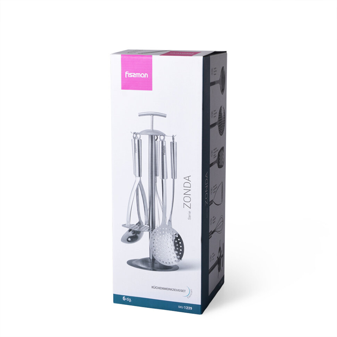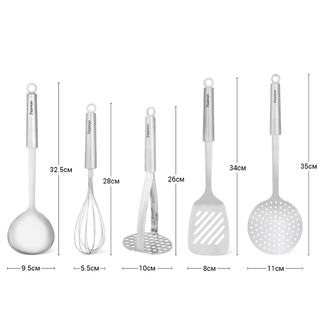 Pilnīgs 5 galveno virtuves instrumentu komplekts ar statīvu. Komplektā atradīsiet visu, kas nepieciešams ikdienas ēdiena gatavošanai: no zupas liešanas līdz kartupeļu stampēšanai. Tas ir lielisks risinājums tiem, kas vēlas uzturēt kārtību virtuvē un vienmēr turēt instrumentus pa rokai.