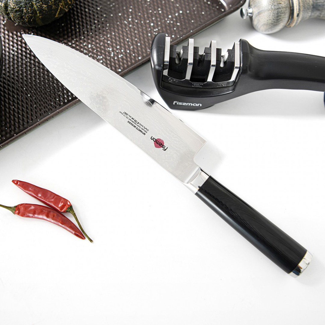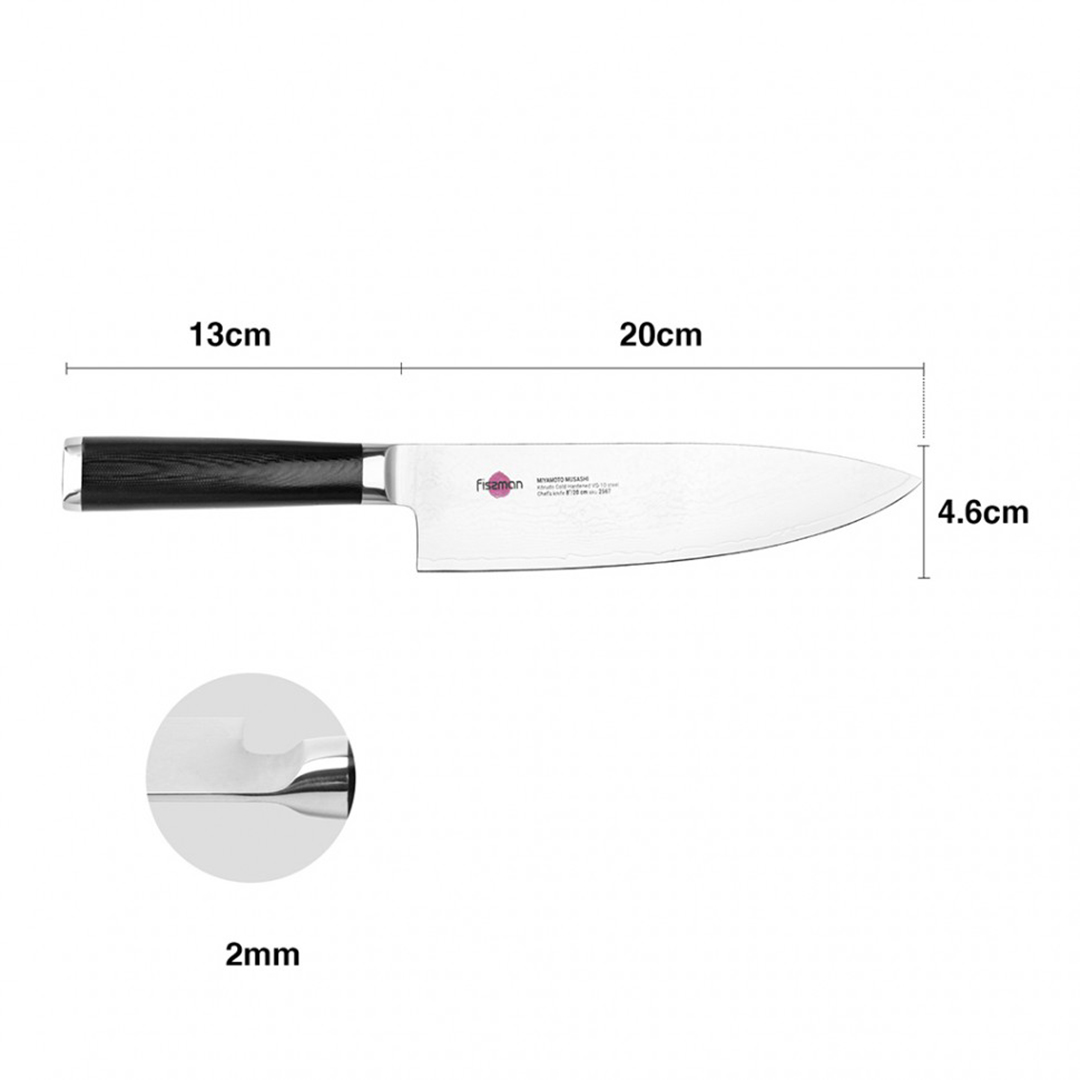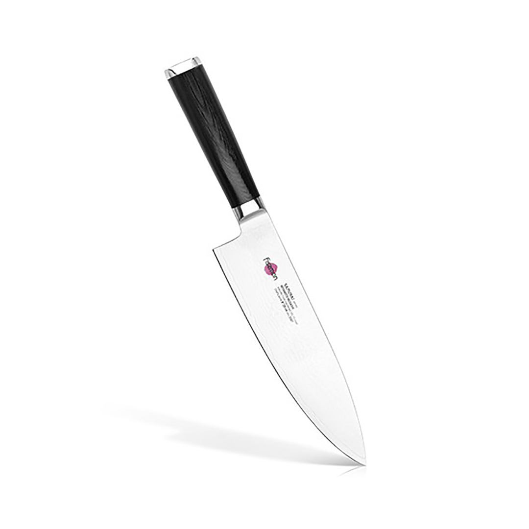 Specifikācijas Tips: Šefpavāra nazis Preču zīme: Fissman Sērija: KENSEI MUSASHI Modelis: F-2567 Asmens materiāls: Damaskas tērauds (67 slāņi), VG-10 serde Asmens cietība: 61 HRC (pēc Rokvela skalas) Roktura materiāls: G-10 stikla šķiedra Asmens garums: 20 cm Asināšanas leņķis: 15-17° (katrā pusē) Asināšanas metode: Honbazuke Ražotājs: Fissman (Dānija) Svars: ~0.24 kg Iepakojuma izmēri: 40 x 9 x 4 cm