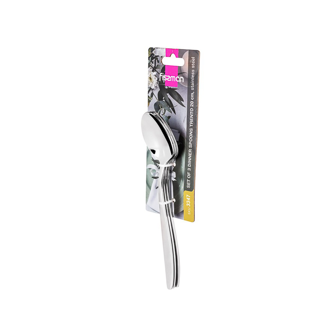 Specifikācijas Tips: Galda karošu komplekts Zīmols: Fissman Sērija: Trento Modelis: F-3347 Materiāls: Nerūsējošais tērauds 18/0 Virsma: Spīdīga Gab. skaits: 3 Garums (vienas karotes): 20.5 cm Ražotājs: Fissman (Dānija) Svars (komplekta): ~0.2 kg Iepakojuma izmēri: 25 x 9 x 3 cm