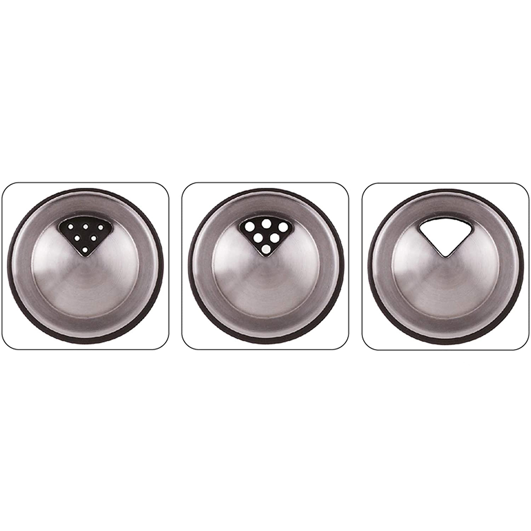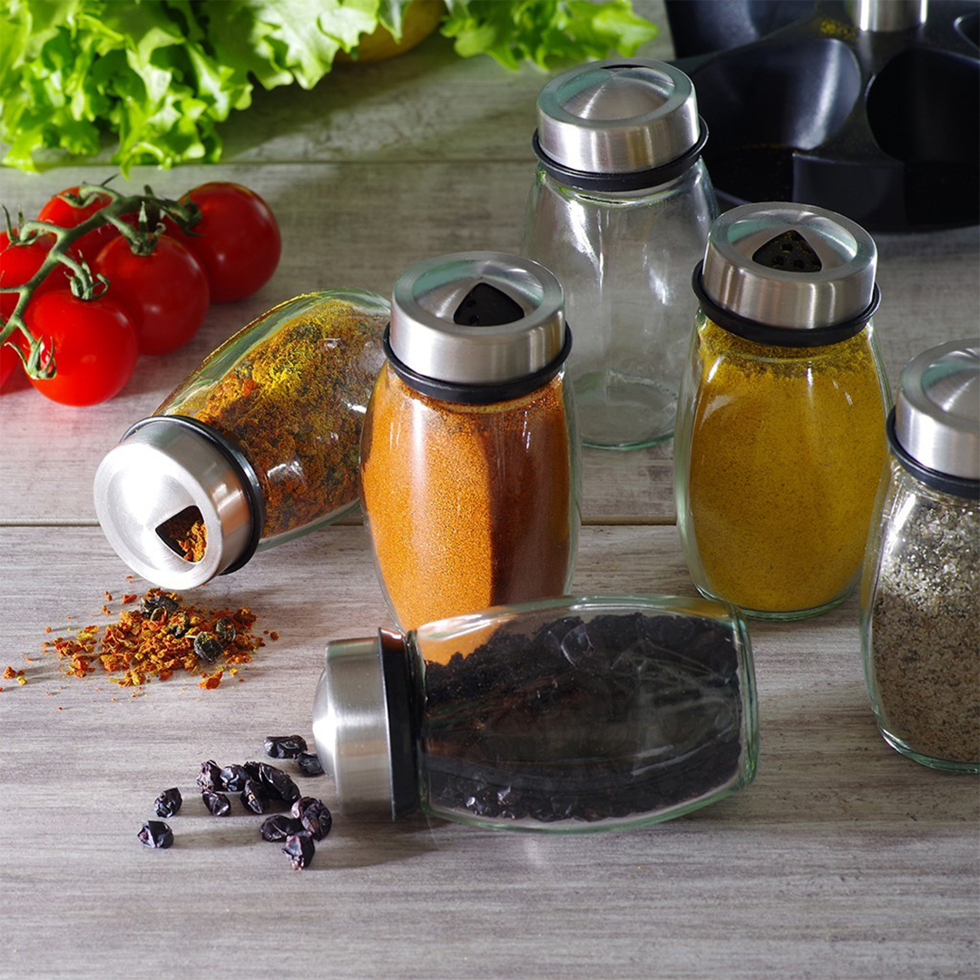 Komplektā ietilpst 6 stikla burciņas. Caurspīdīgais stikls ļauj viegli redzēt, kura garšviela ir iekšā un cik daudz tās ir palicis. Inovatīvi nerūsējošā tērauda vāciņi ir ne tikai hermētiski, bet tiem ir arī trīs veidu atveres dozēšanai – varēsiet izvēlēties Jums ērtāko veidu, kā pievienot ēdienam garšu: smalku kaisīšanu, rupjāku vai atvērtu liešanas atveri.