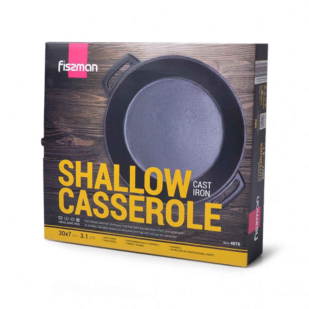 Specifikācijas Tips: Dziļa panna / Sautēšanas katls Preču zīme: Fissman Modelis: F-4076 Materiāls: Čuguns Diametrs: 30 cm Augstums: 7 cm Tilpums: 3.2 L Plīts veidi: Gāzes, elektriskā, stikla keramikas, indukcijas Var izmantot cepeškrāsnī: Jā Ražotājs: Fissman (Dānija) Svars: ~4.5 kg Iepakojuma izmēri: 32 x 32 x 8 cm