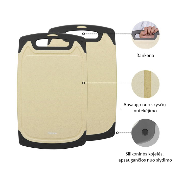 Speciālais plastmasas blīvums ir izvēlēts tā, lai griežot naži pēc iespējas ilgāk saglabātu asumu. Virsma ir pietiekami mīksta, lai neattērpētu asmeņus, bet tajā pašā laikā pietiekami izturīga, lai izturētu ikdienas lietošanu. Ērts izgriezums-rokturis ļauj dēli ne tikai ērti paņemt, bet arī pakarināt.