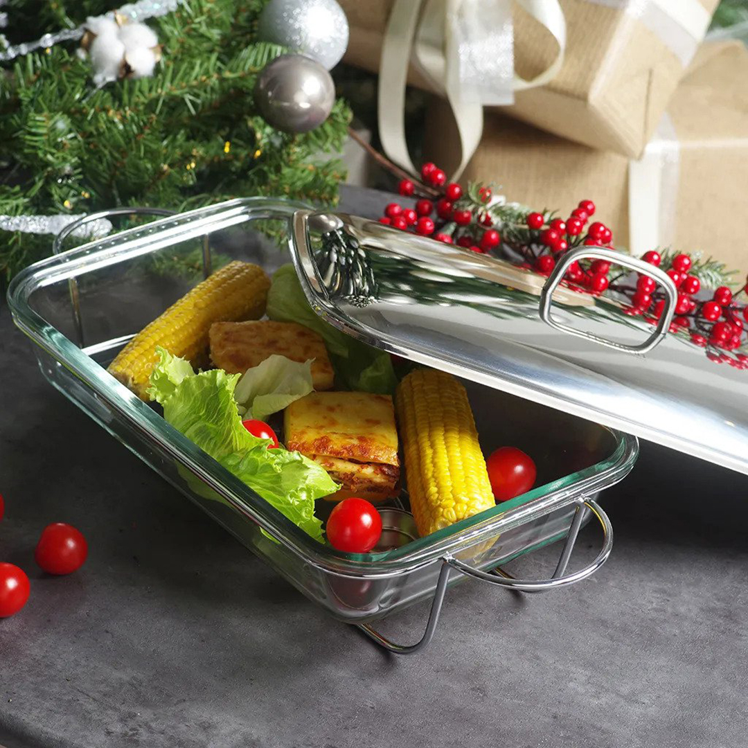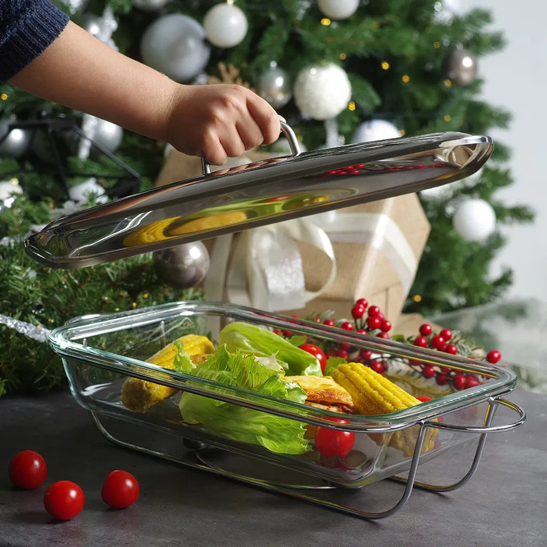 - Vai stikla trauku var ievietot tieši no karstas cepeškrāsns statīvā? Jā, borosilikāta stikla trauks ir izturīgs pret temperatūras izmaiņām, un statīvs ir piemērots karsta trauka turēšanai.