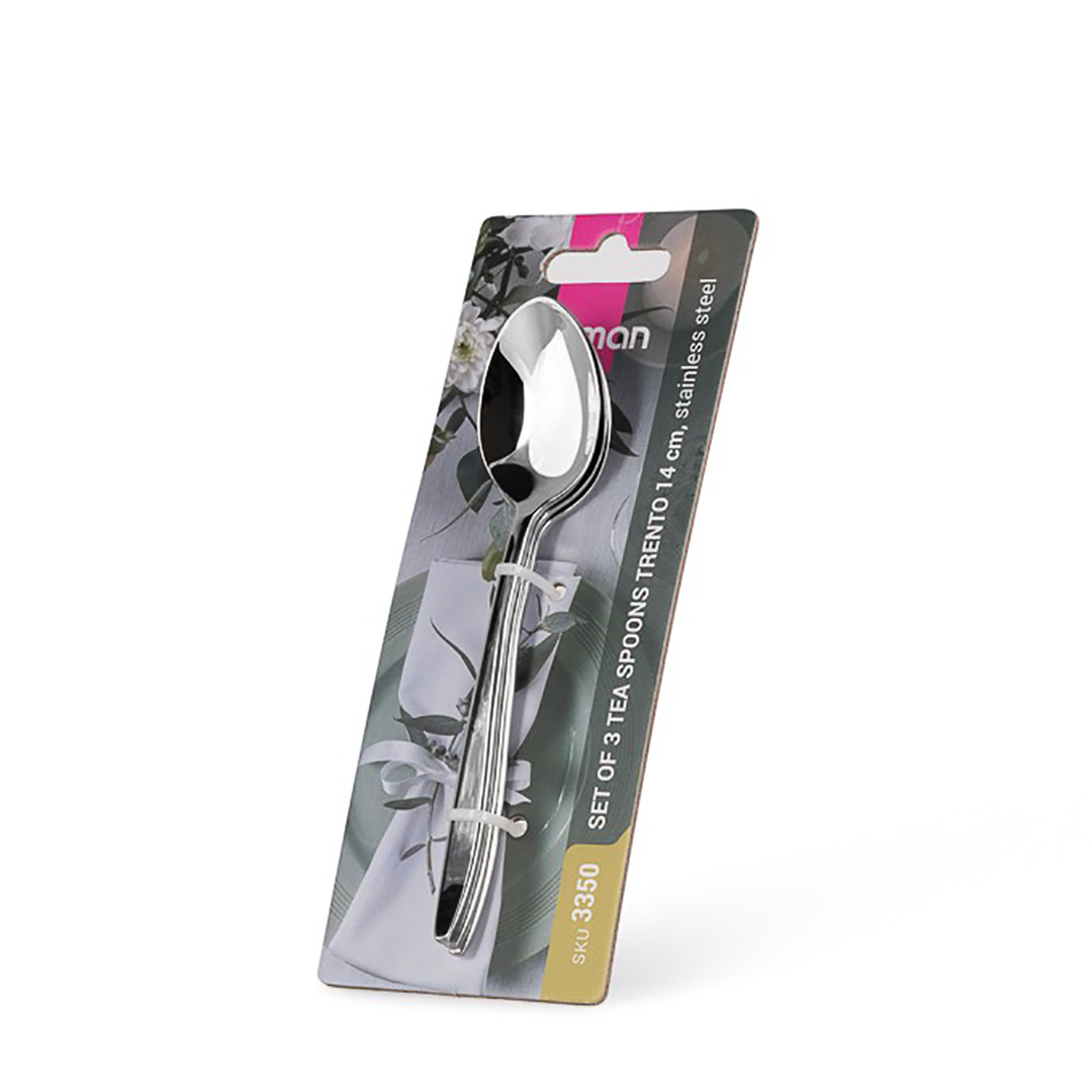 “Trento” tējas karotīšu komplekts ir praktisks un elegants veids, kā papildināt esošo galda piederumu kolekciju vai aizstāt pazaudētos. Klasiskais, minimālistiskais dizains un spoguļglancētais spīdums lieliski papildinās jebkuru galda klājumu, piešķirot tam svinīgumu un solidaritāti.