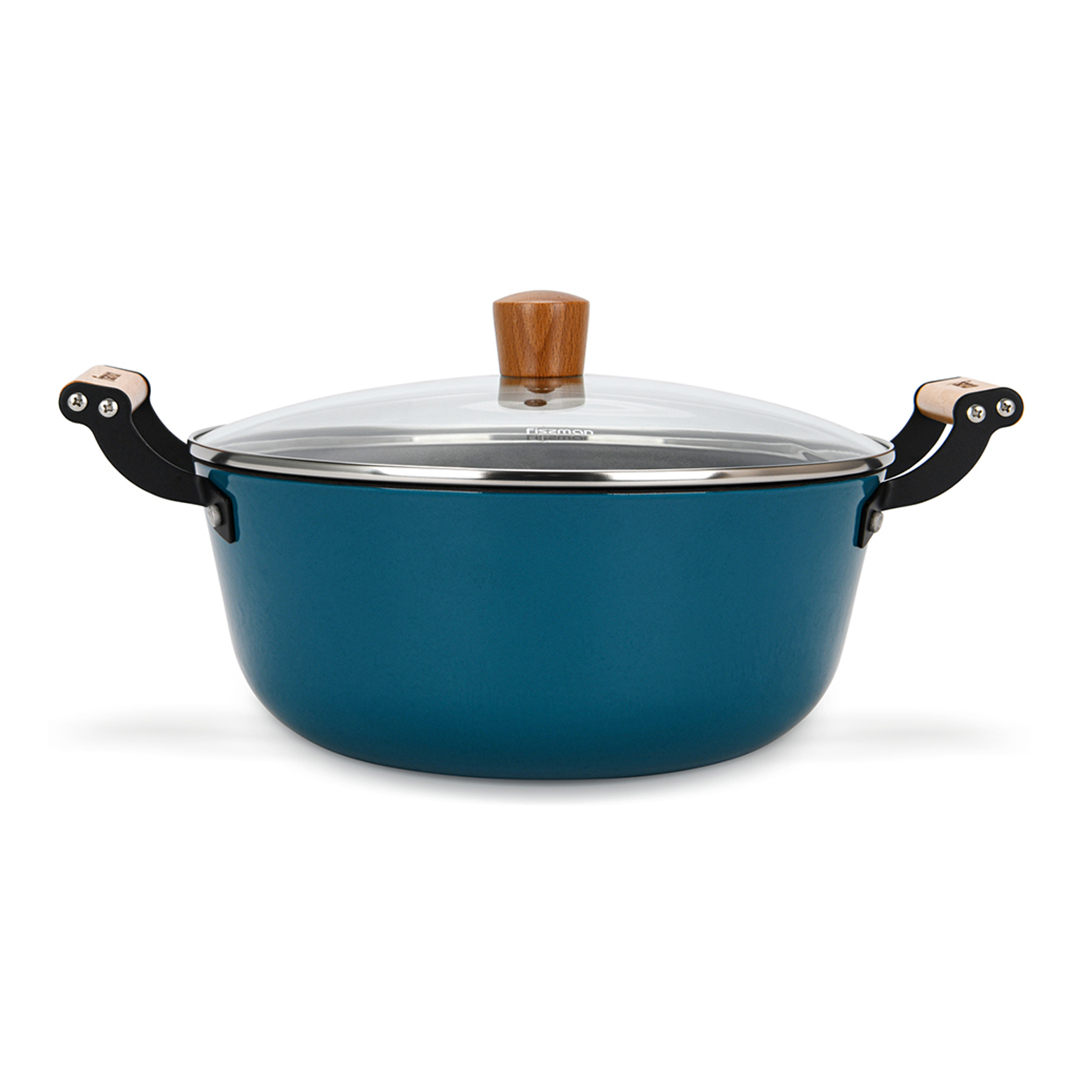 Svaigā jūras zaļā emalja un rokturi no dabīga koka piešķir katlam izcilu šarmu un pārvērš to par virtuves rotājumu. Koka rokturi gatavošanas laikā nekarst, tāpēc katlu vienmēr paņemsiet droši un ērti. Komplektā iekļautais stikla vāks ļauj novērot gatavošanas procesu, to nepārtraucot.