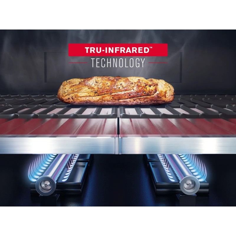 • 2 daļu režģu sistēma: Grils ir aprīkots ar 2 daļu režģu sistēmu, kas apvieno nerūsējošā tērauda emitera plāksnes un ar porcelānu pārklātus čuguna režģus. Šis pārdomātais dizains nodrošina vienmērīgu siltuma sadalījumu, kas rada izcilus grilēšanas rezultātus, kas noteikti iepriecinās jūsu garšas kārpiņas.
