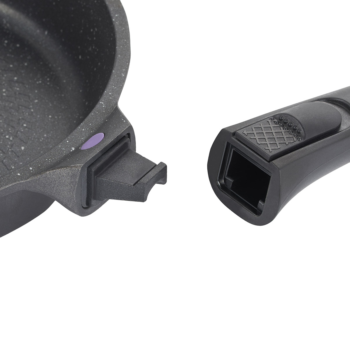 Vietas Taupīšana: Noņemamais rokturis ļauj kompakti salikt pannas skapīšos vai trauku mazgājamā mašīnā, ietaupot daudz vietas.