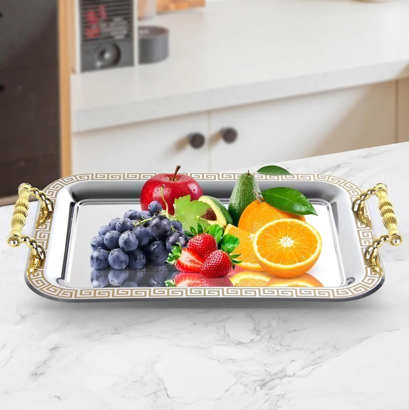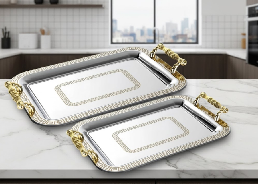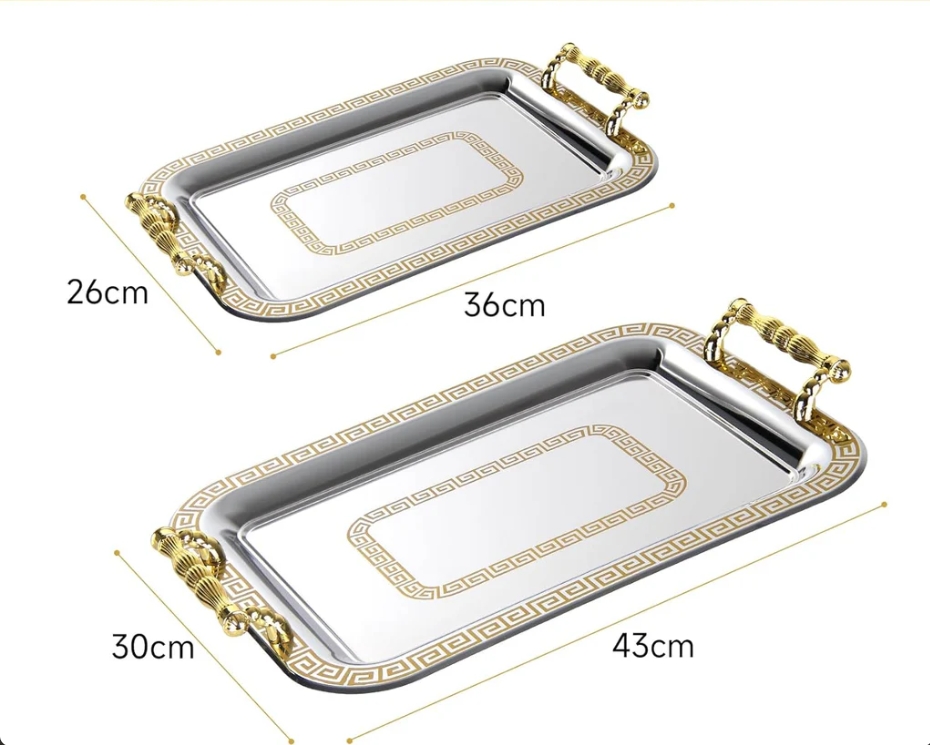 Šis stilīgais 2 daļu palešu komplekts apvieno greznu izskatu ar praktisku ērtumu. Ideāli piemērots dzērienu, uzkodu vai ēdienu servēšanai un ir elegants papildinājums jebkuram gadījumam. Paletes izgatavotas no augstas kvalitātes nerūsējošā tērauda, un izturīgie rokturi ir izgatavoti no plastmasas, kas imitē zelta krāsas metālu.