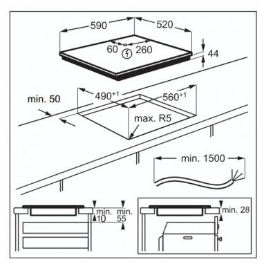 Sagatavojiet $560times490$ mm izgriezumu darba virsmā, nodrošinot vismaz 50 mm attālumu līdz aizmugurējai sienai.