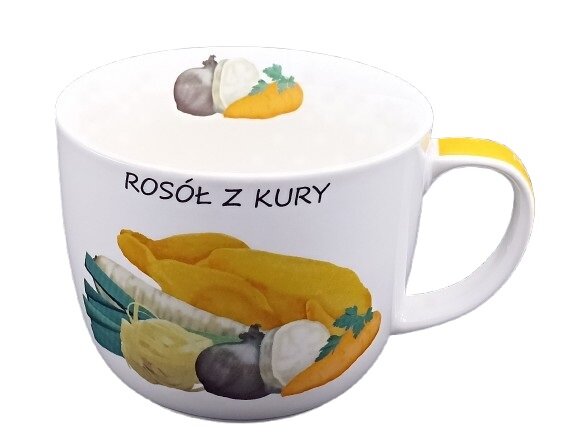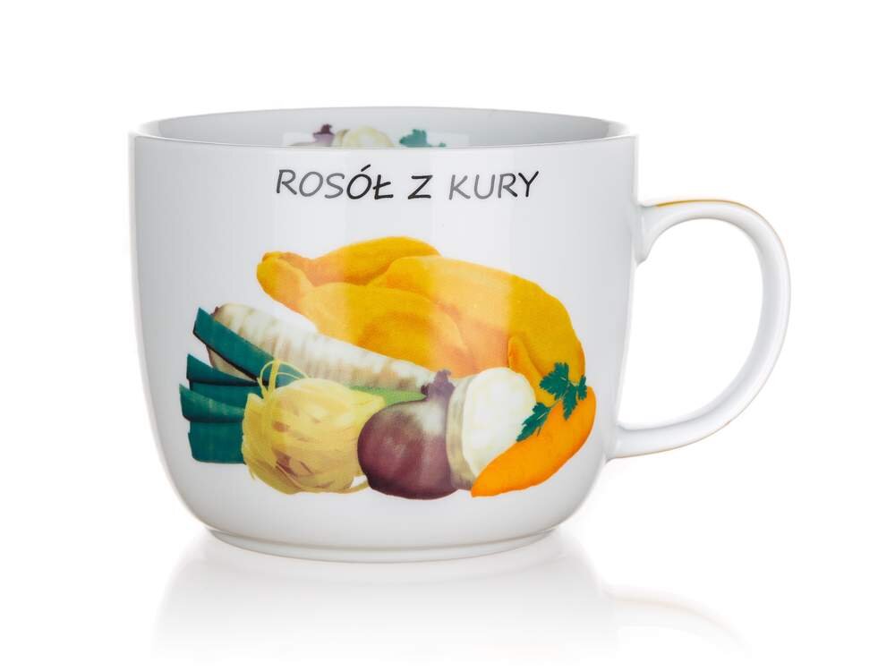 - Vizuālā pievilcība: Krūzes priekšpusi rotā mājīgs zīmējums, kurā attēlotas buljonam nepieciešamās sastāvdaļas – vista, burkāni, pētersīļi un garšvielas. Augšpusē esošais uzraksts “ROSÓŁ Z KURY” piešķir traukam autentisku šarmu.