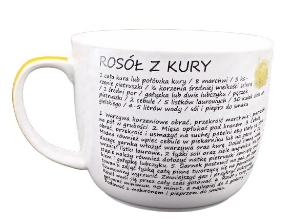 - Recepte uz krūzes: Otrā puse kalpo kā recepšu grāmata – šeit atradīsiet detalizētu vistas buljona recepti poļu valodā. Tā ir ne tikai dekorācija, bet arī praktisks suflieris gatavošanā.