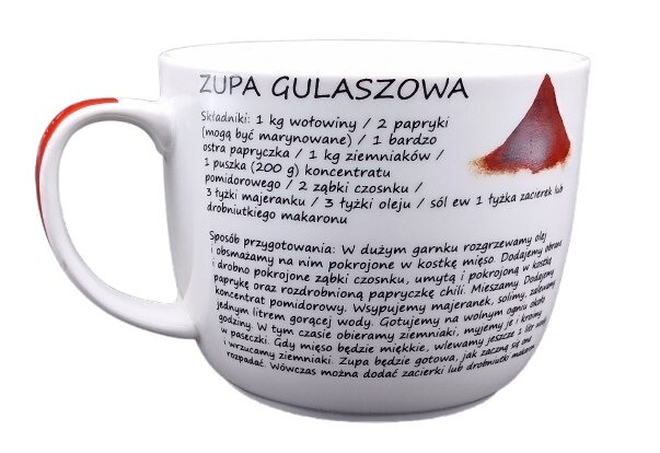 - Vizuālā pievilcība: Krūzes priekšpusi rotā krāsains zīmējums, kurā attēlotas gulaša zupai nepieciešamās sastāvdaļas. Augšpusē ir uzraksts “ZUPA GULASZOWA”, kas piešķir traukam autentiskumu.
