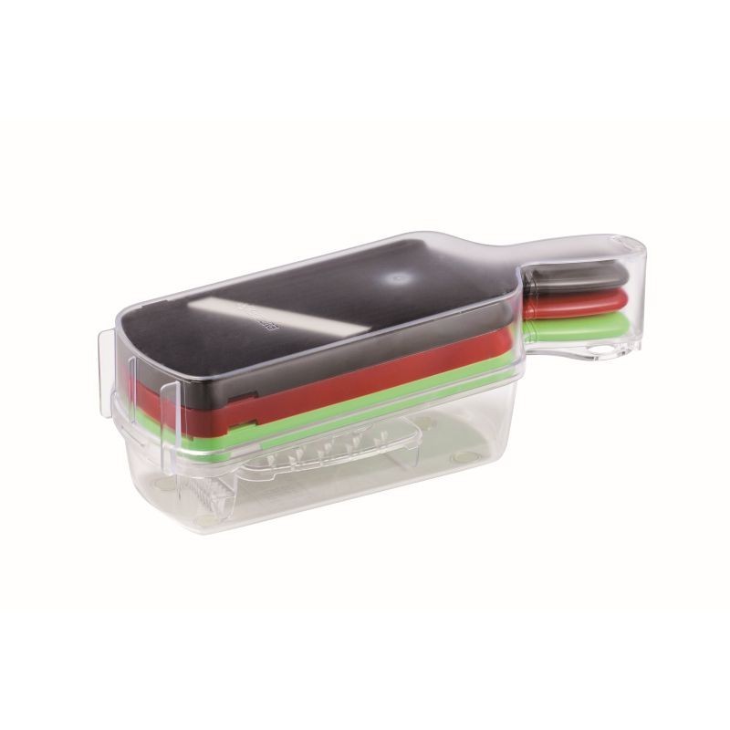 Daudzkrāsainajā komplektā ietilpst keramikas griešanas nazis, regulējams keramikas nazis, rīve, pirkstu aizsargs un caurspīdīga plastmasas uzglabāšanas tvertne.