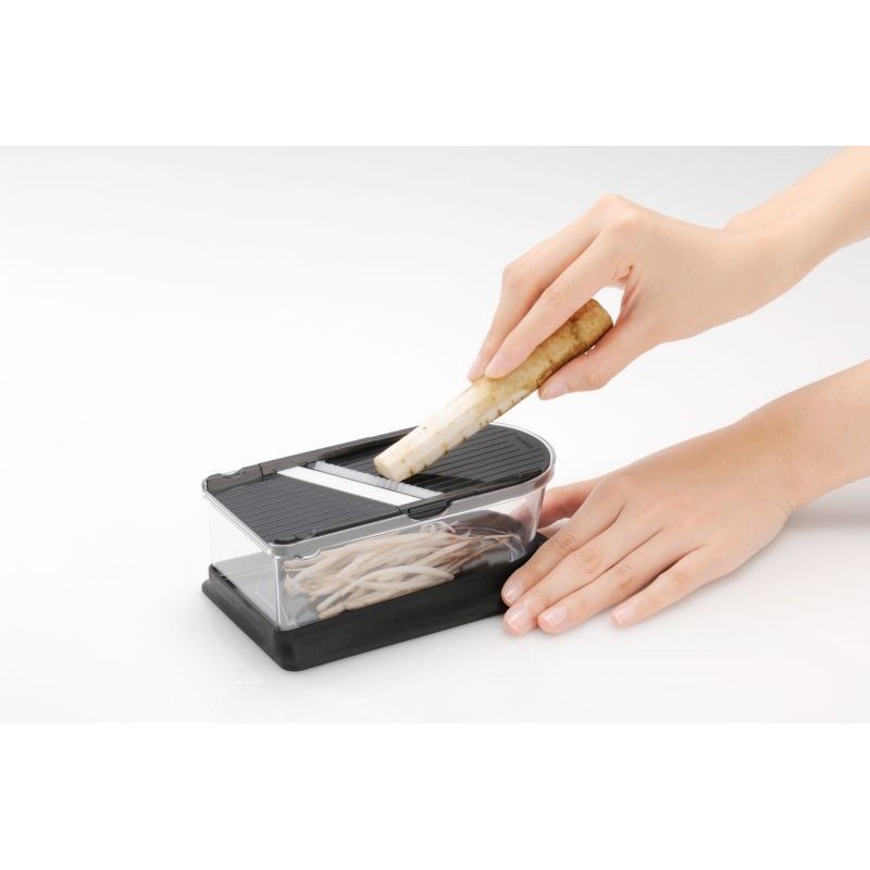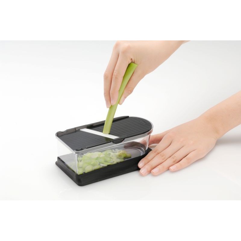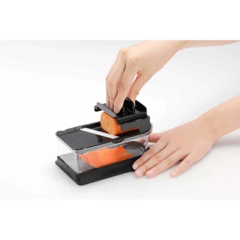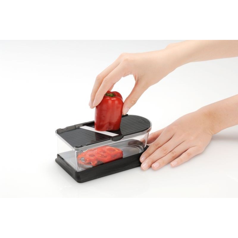 Pirkstu aizsargs aizsargā jūsu rokas un neļauj sagrieztajiem dārzeņiem aizlidot pāri galdam, tāpēc tie nonāk tieši traukā.