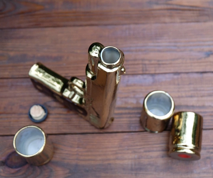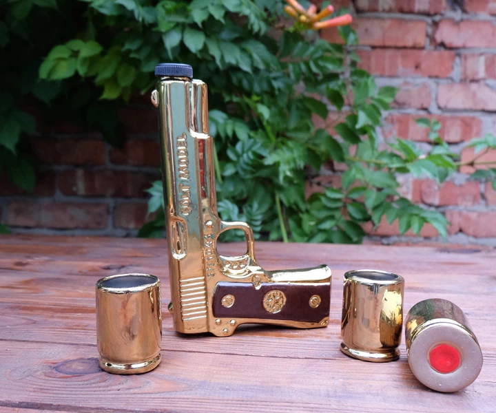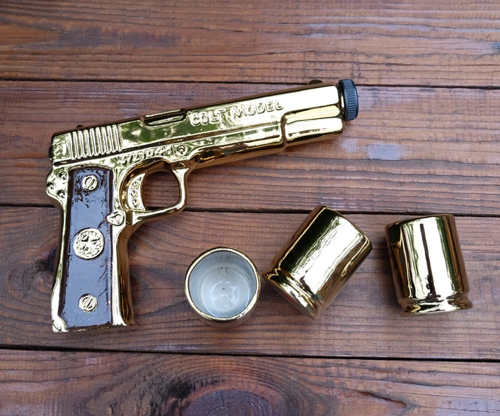 Piedāvājam oriģinālu dāvanu komplektu – zelta krāsas pistoli “Colt”. Tas ir ne tikai stilīgs suvenīrs, bet arī funkcionāla taras dzērieniem. Komplekts izceļas ar savām detaļām: komplektā ar “ieroci” nāk trīs glāzītes, kas stilizētas kā patronu čaulītes (gilzes). Tā ir lieliska izvēle tiem, kas meklē dāvanu medniekam, virsniekam vai ieroču entuziastam.