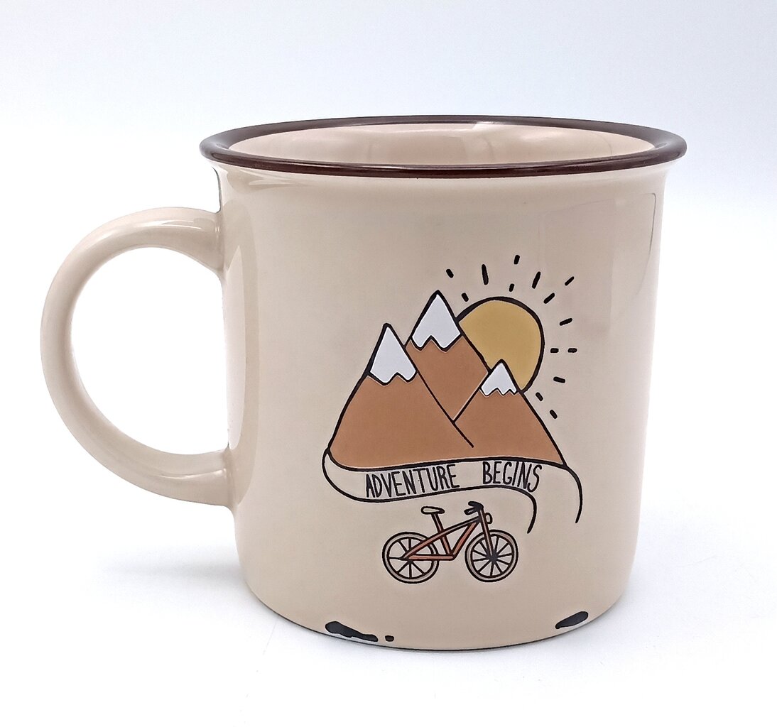 - Retro motīvs: Krūzi rotā stilīgs senlaicīgs automobilis ar velosipēdu uz jumta un rotaļīgu uzrakstu “RIDE ME!”. Tas ir lielisks aksesuārs piedzīvojumu meklētājiem un kempinga estētikas cienītājiem.
