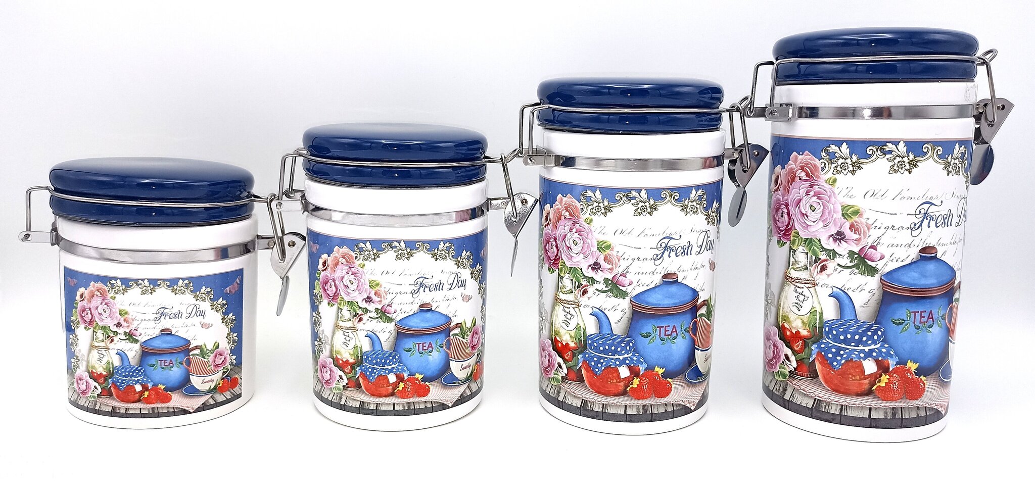 - Dizains: Trauki dekorēti ar mājīgu Provansas stila zīmējumu ar uzrakstu “Fresh Day”, ziediem, tējas un ogu motīviem. Tumši zilas krāsas vāki un detaļas piešķir elegantu kontrastu.